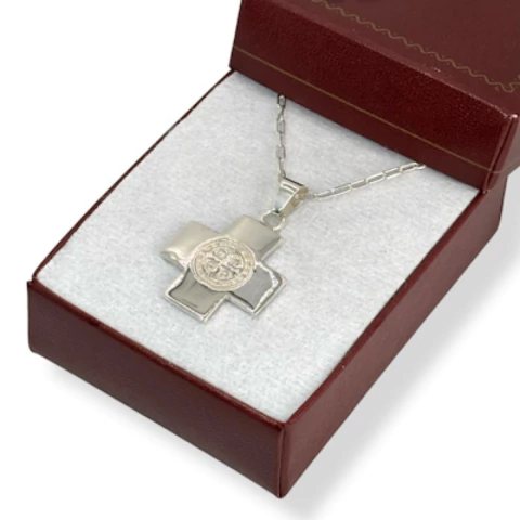 Cadena Eslabón Forzet Largo y Cruz del Equilibrio con imagen de San Benito.